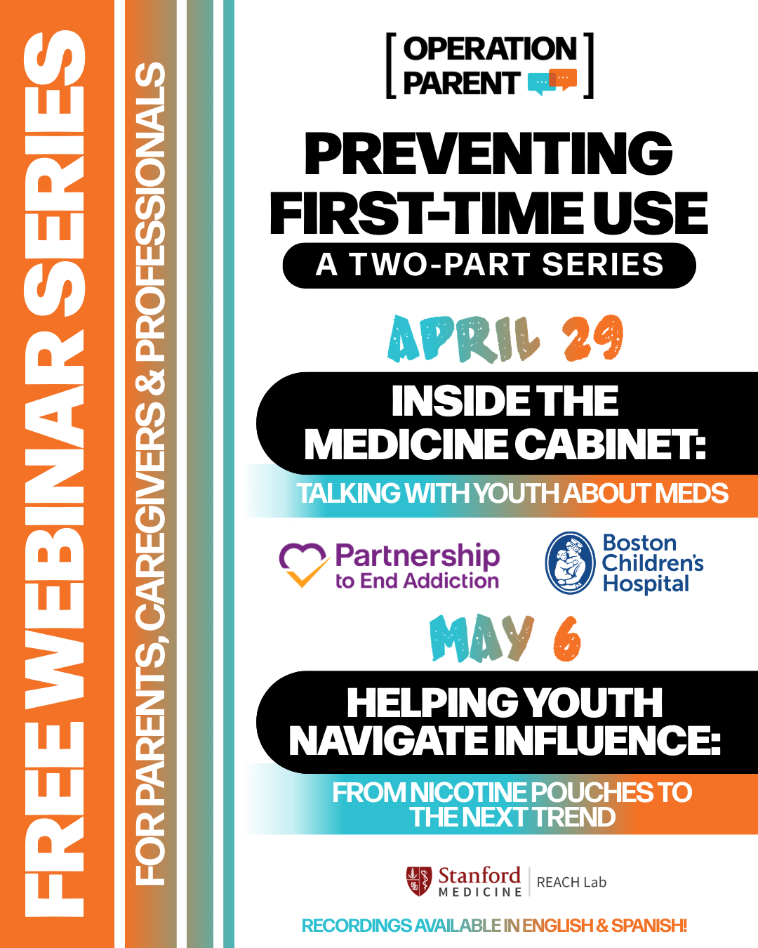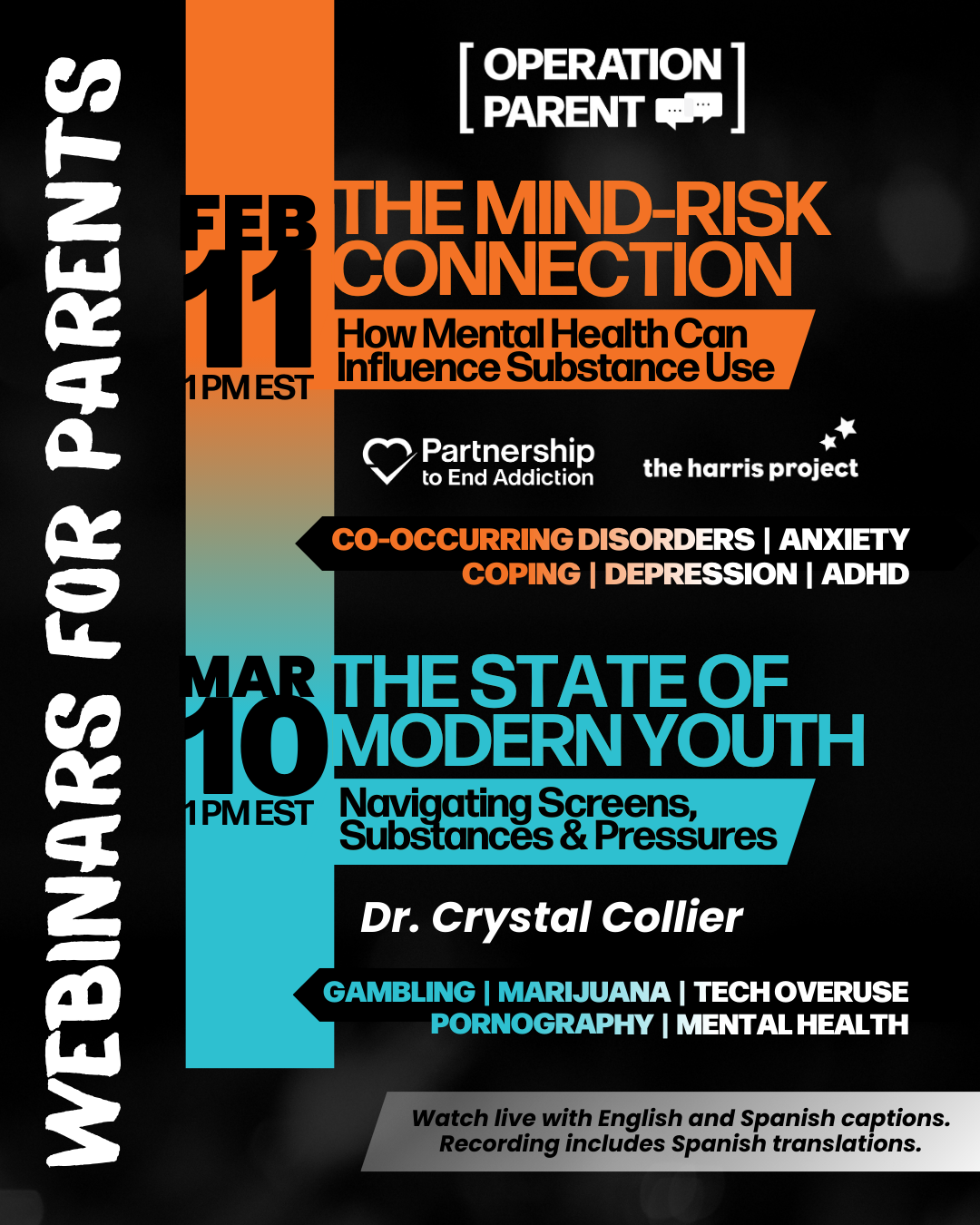 Our free webinars bring expert advice and practical tips straight to parents — live each month and anytime through our webinar library. With our ready-to-use flyers, social media posts, and promo graphics, you can help families discover topics that matter most, from technology and mental health to substance prevention. When you share our upcoming line-up or highlight the power of our recorded sessions, you open the door for parents to learn, connect, and feel more confident.